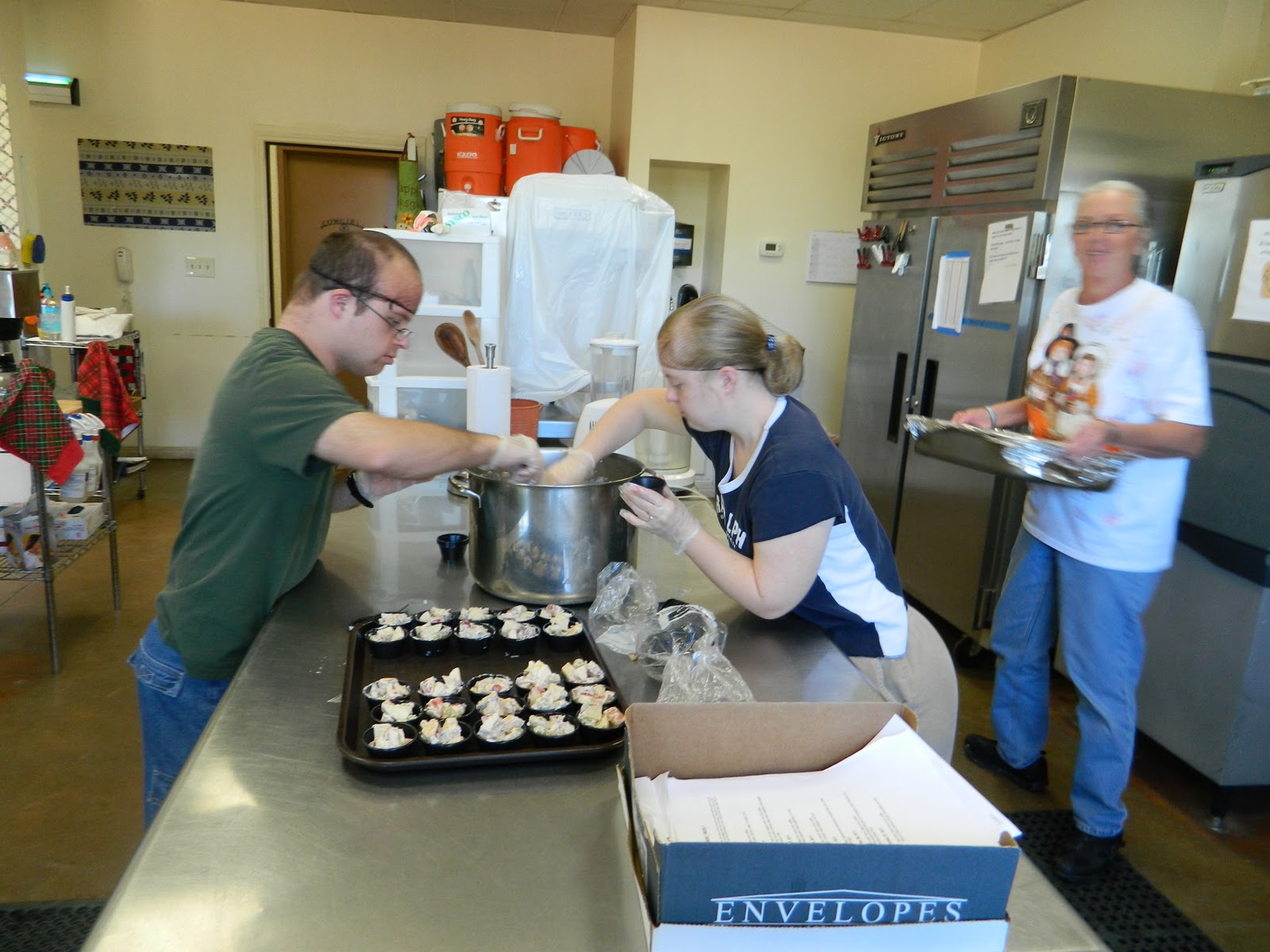 | Mike & Kara fill relish cups as Gig looks on |