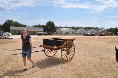 Debbie instructed me in the intricacies of about 5,000 pieces of leather, rings, bits, blinders, cruppers, and other bits of leather and metal that have not yet been engraved in my memory banks and we finally got Sally hitched up. Annette showed up and helped us lift the cart down off the concrete apron of the Spur barn, and off we went.