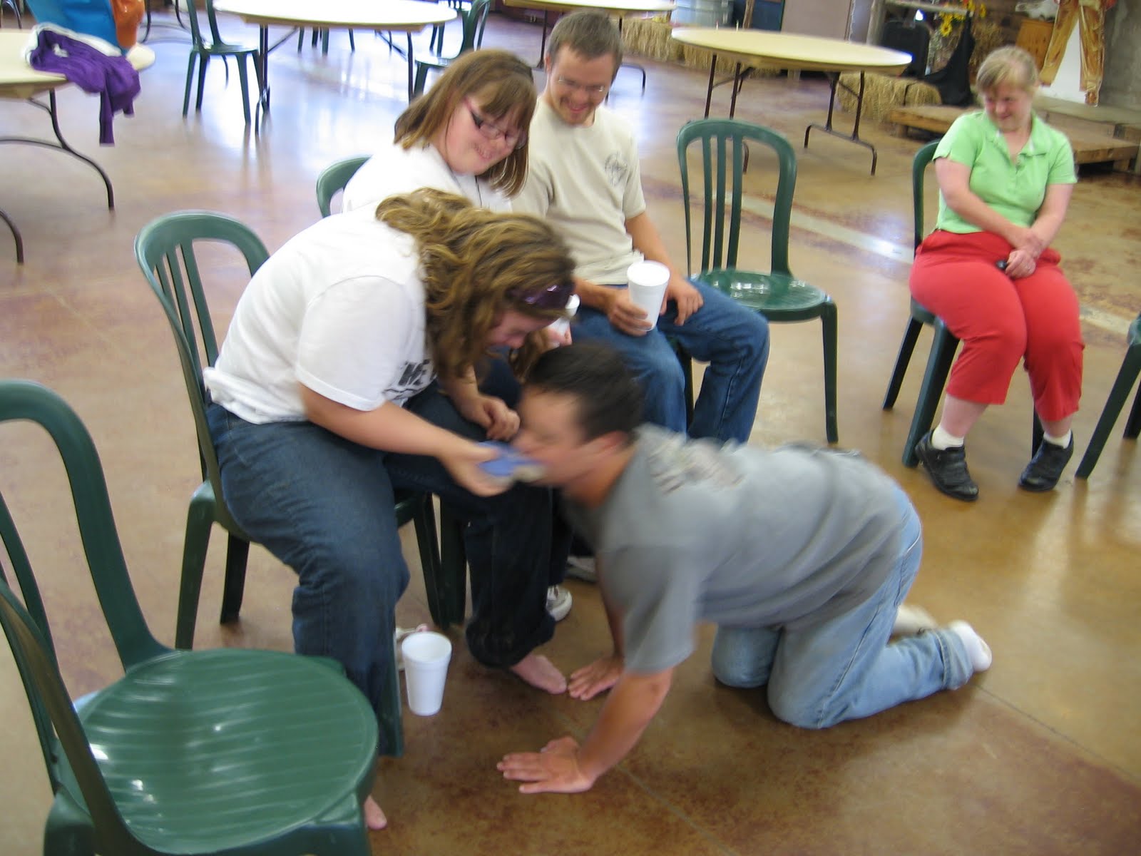 Couldn’t be simpler! Participants sit in a circle, and “Kitty” crawls from person to person looking pitiful. Kitty can meow, purr, hiss, and pretend to bare her claws at you or try any anything else she thinks might make you laugh.