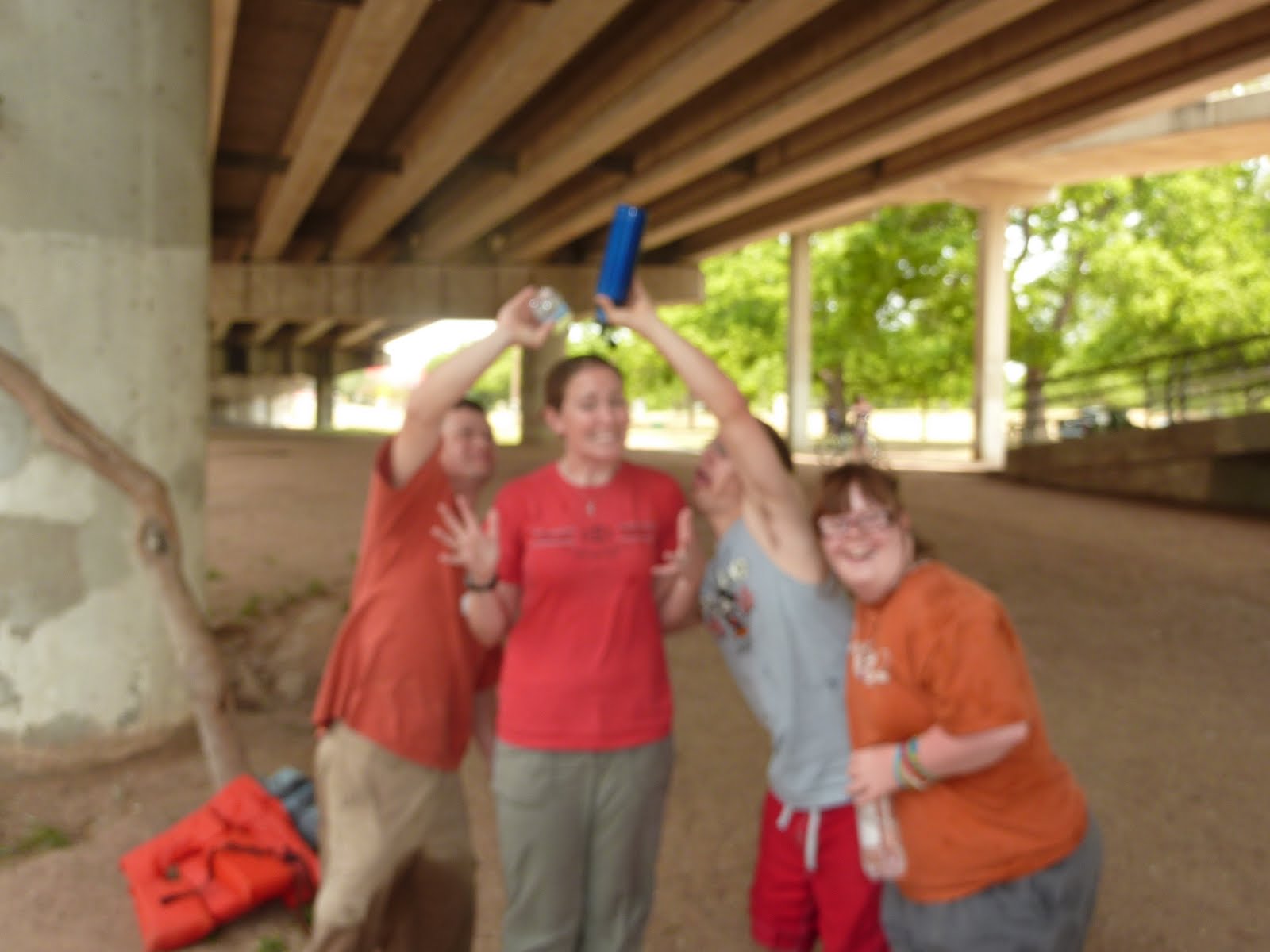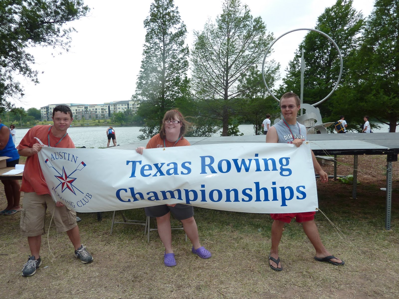 Since Casey and Matt met on the A and M rowing team, Casey has expertise for a Special Olympics sport not many coaches can boast, so last summer she offered to take those Ranchers willing to try their hand at kayaking to Austin each Sunday for several weeks to practice on Town Lake. Kyle, Sterling, and Kelly signed up. They’ve been practicing for the past several weeks for their first kayaking regatta.
