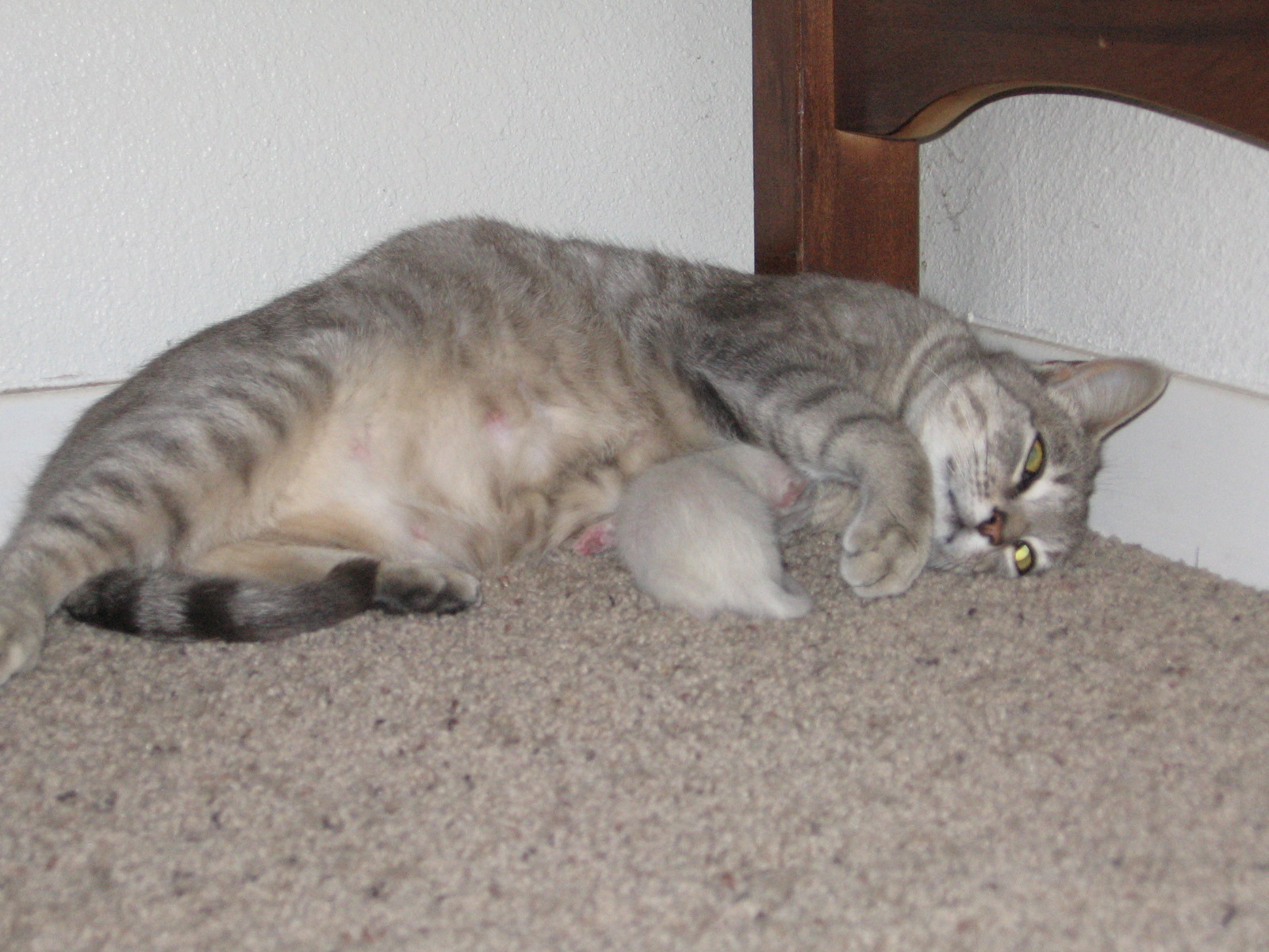 Baby kitty seemed exceptionally large and vigorous to me. I didn’t try to pick him or her up. I examined mama and felt two more in there, and sure enough last night they were born. Natalie and Crystal are ecstatic.