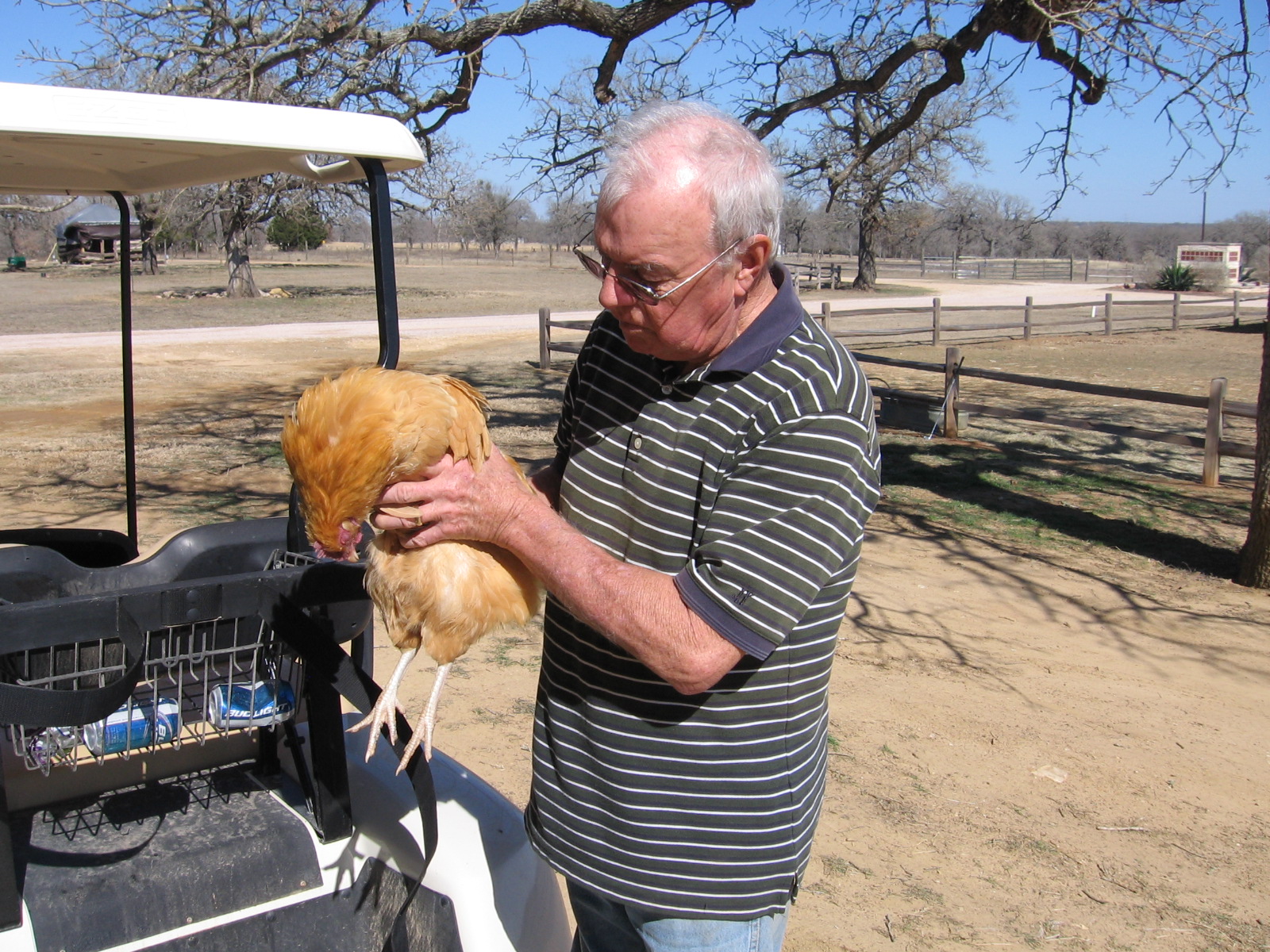 I walked over to the Hilton, put the hen on the back of Jerry’s cart, and helped him coop up the rest of the chickens. They were rattled and skittish, and it took a while to get them in.