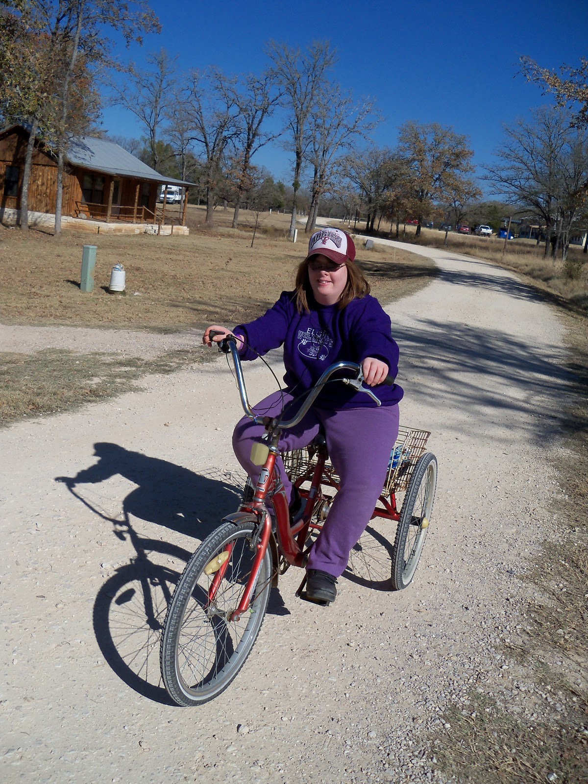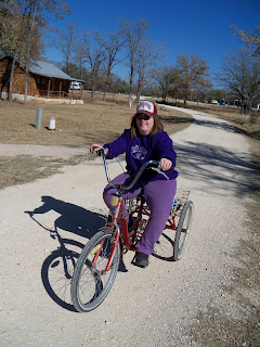 About half the Ranchers were doing laps around the Village loop. Six laps around is two miles. I first encountered Kelly pedaling along singing at the top of her lungs while listening to her MP3 player. She was dressed in every article of purple clothing she owns.