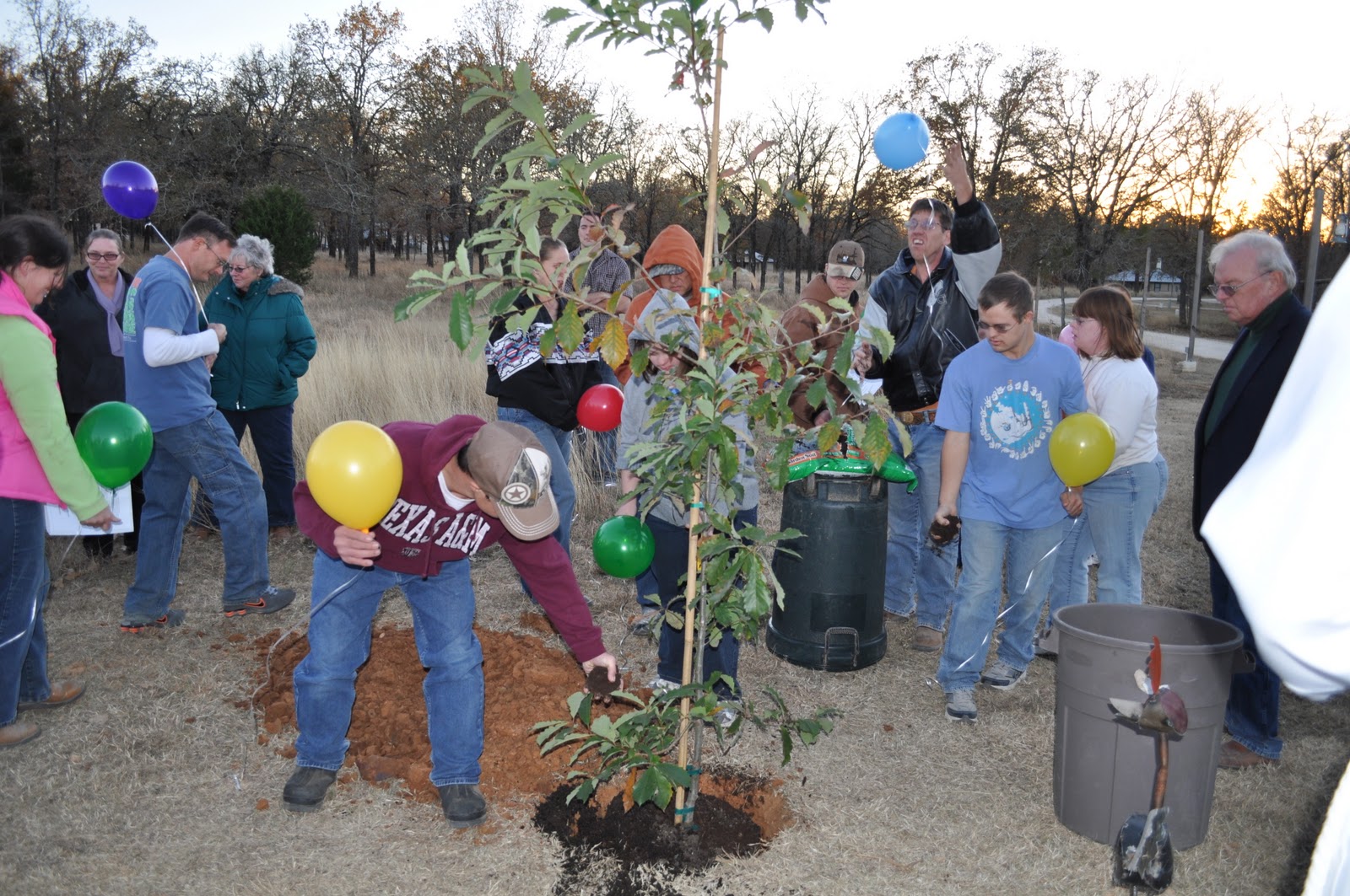 So we decided to have our own memorial service to remember our good friend and buddy Jim. His daughter and granddaughters came out, and Fr. John came to preside over the service. Jerry bought a chinquipin oak to plant–“Jim’s Tree”. Marci blew up 40 balloons for a release after the service and the tree planting.