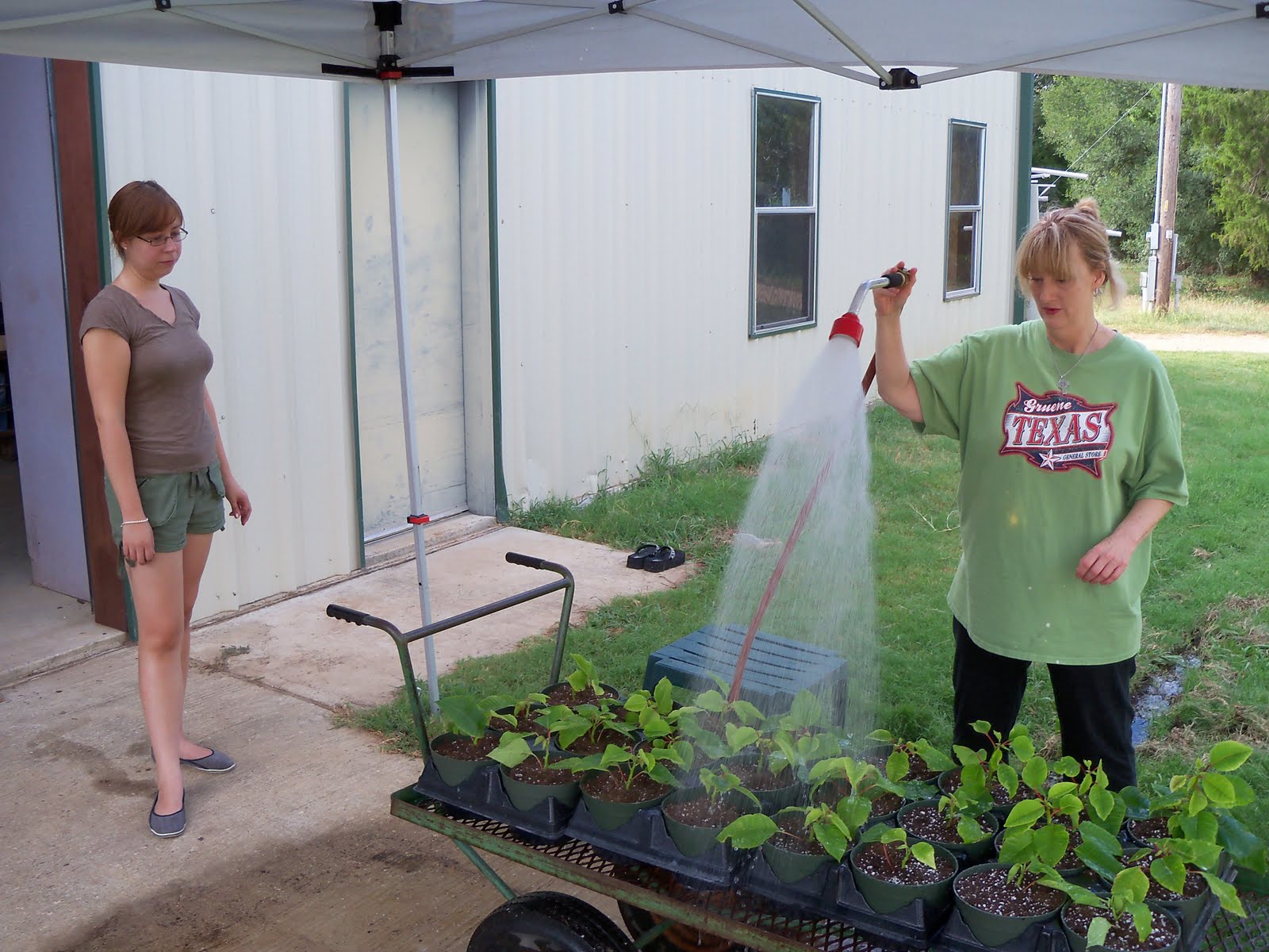Neighbor Linda Potts waters baby points to get them off to a good start while Dell volunteer looks on