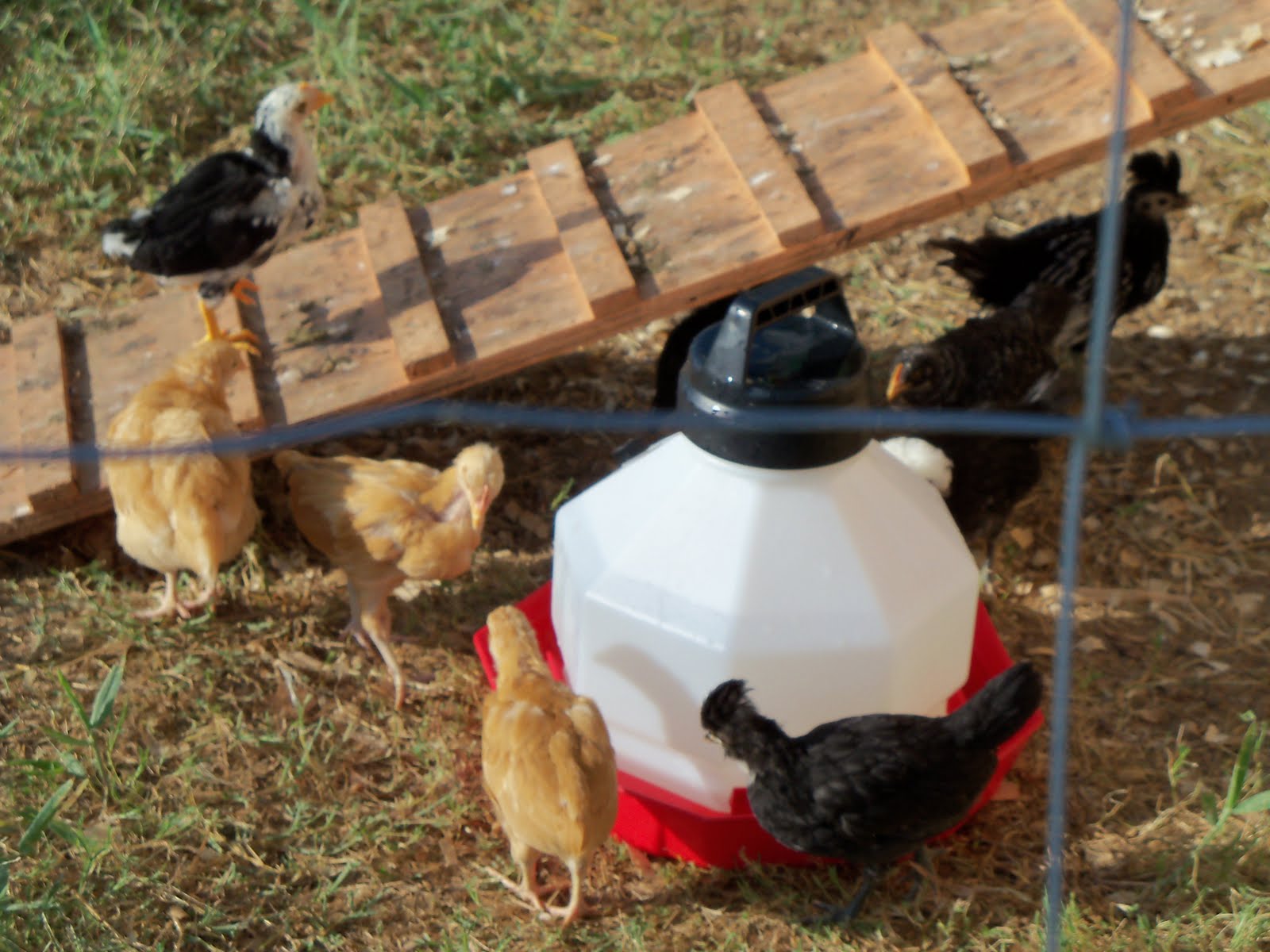 The chicks finally decided it was OK to explore the great outdoors, exiting the Chicken Hilton to explore the grass just outside the door.