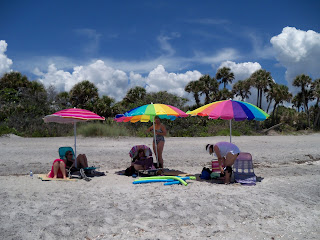 This time we brought umbrellas, mats, and folding chairs. Kelly swam in a heavy T shirt to protect her from the relentless sun. Despite frequent slatherings of high SPF sun screen, our skin tones are varying from lobster red to deepening tan. By vacation’s end we will–intentionally or not–all provide ample evidence of a week’s vacation in Florida.