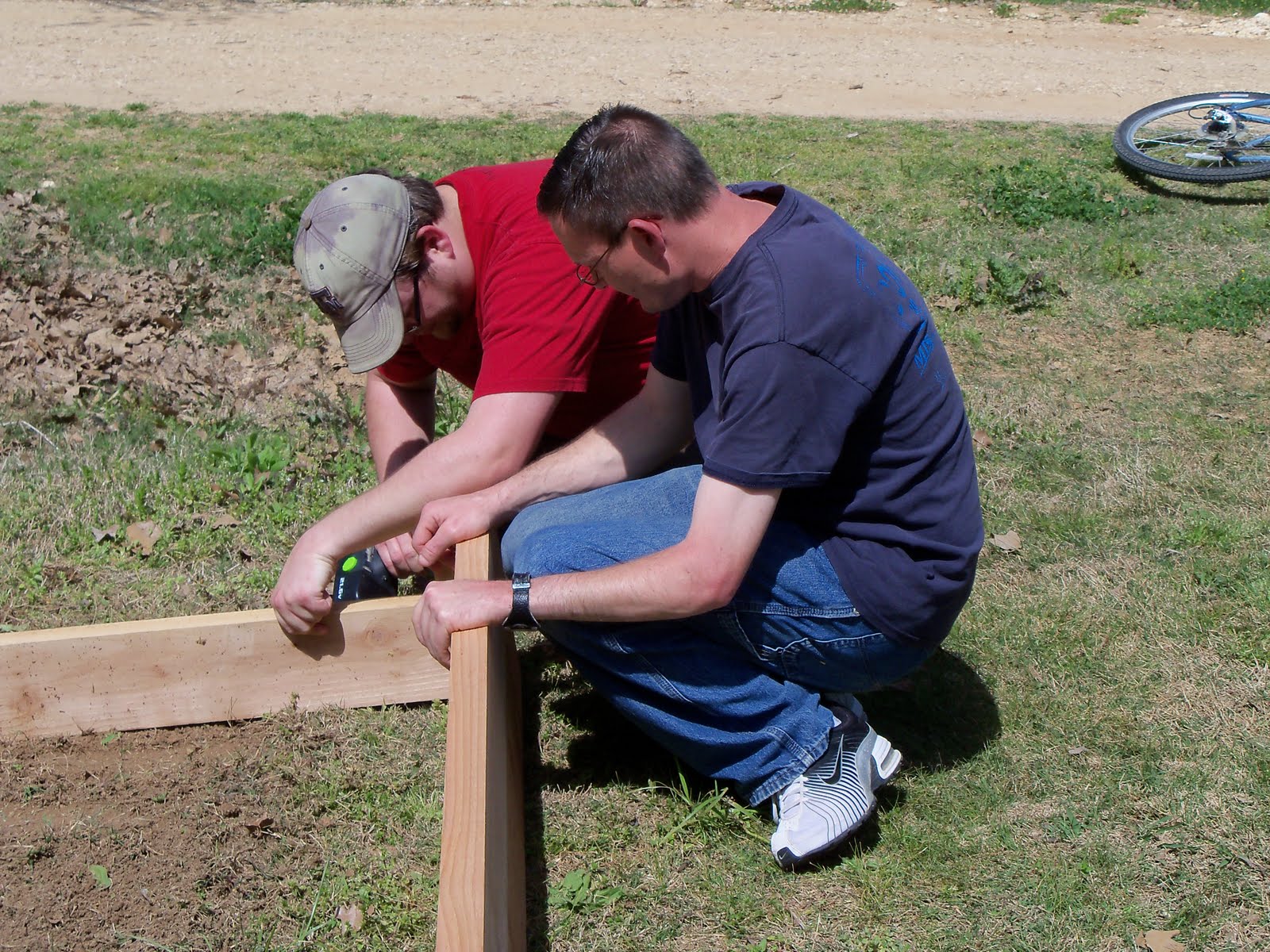 Terry and Alan sat in camp chairs monitoring the progress of the project, which quickly revealed itself to be a 3′ X 5′ raised-bed garden plot that Barry and Michael were building.