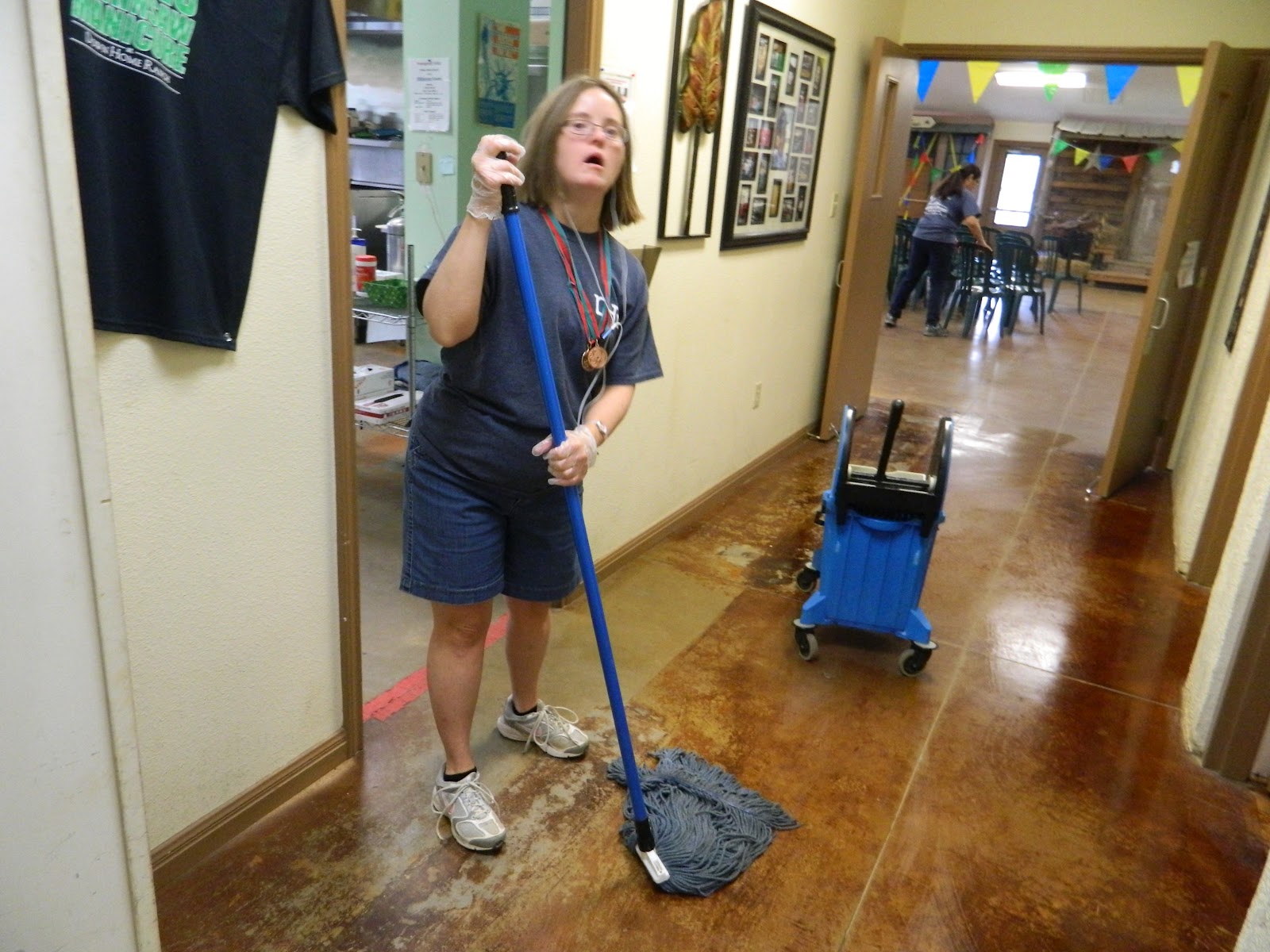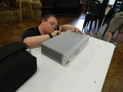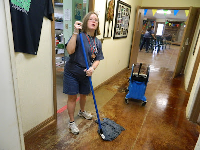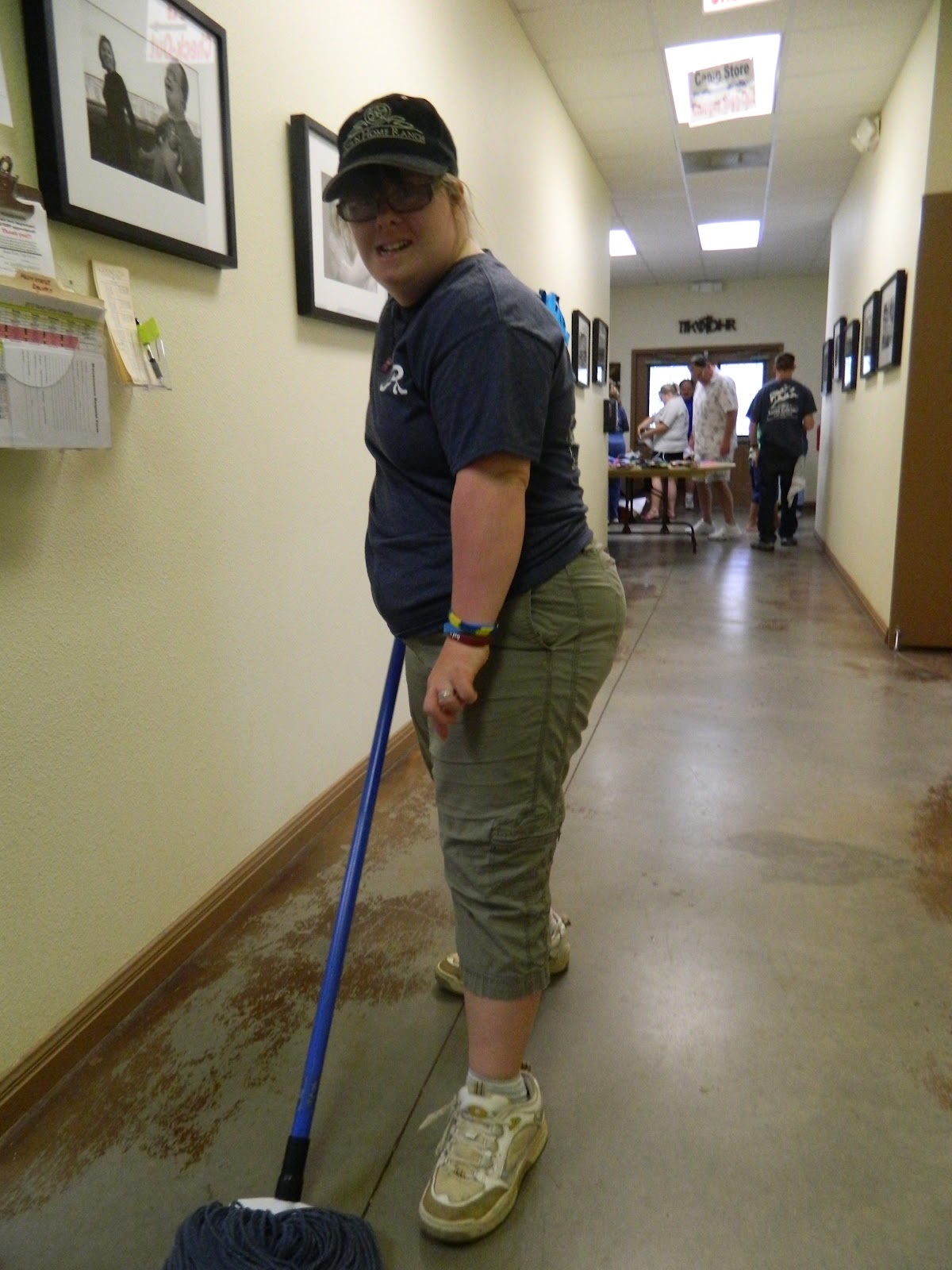 Some were sweeping, some were cleaning and stocking bathrooms, some were mopping. Chris was hooking up the electronic components for the microphones, speakers, and camp DVD show.